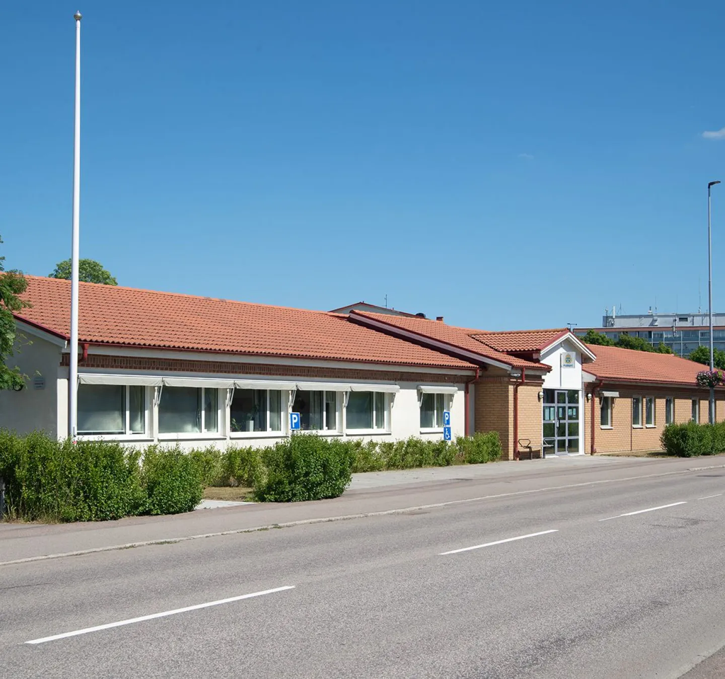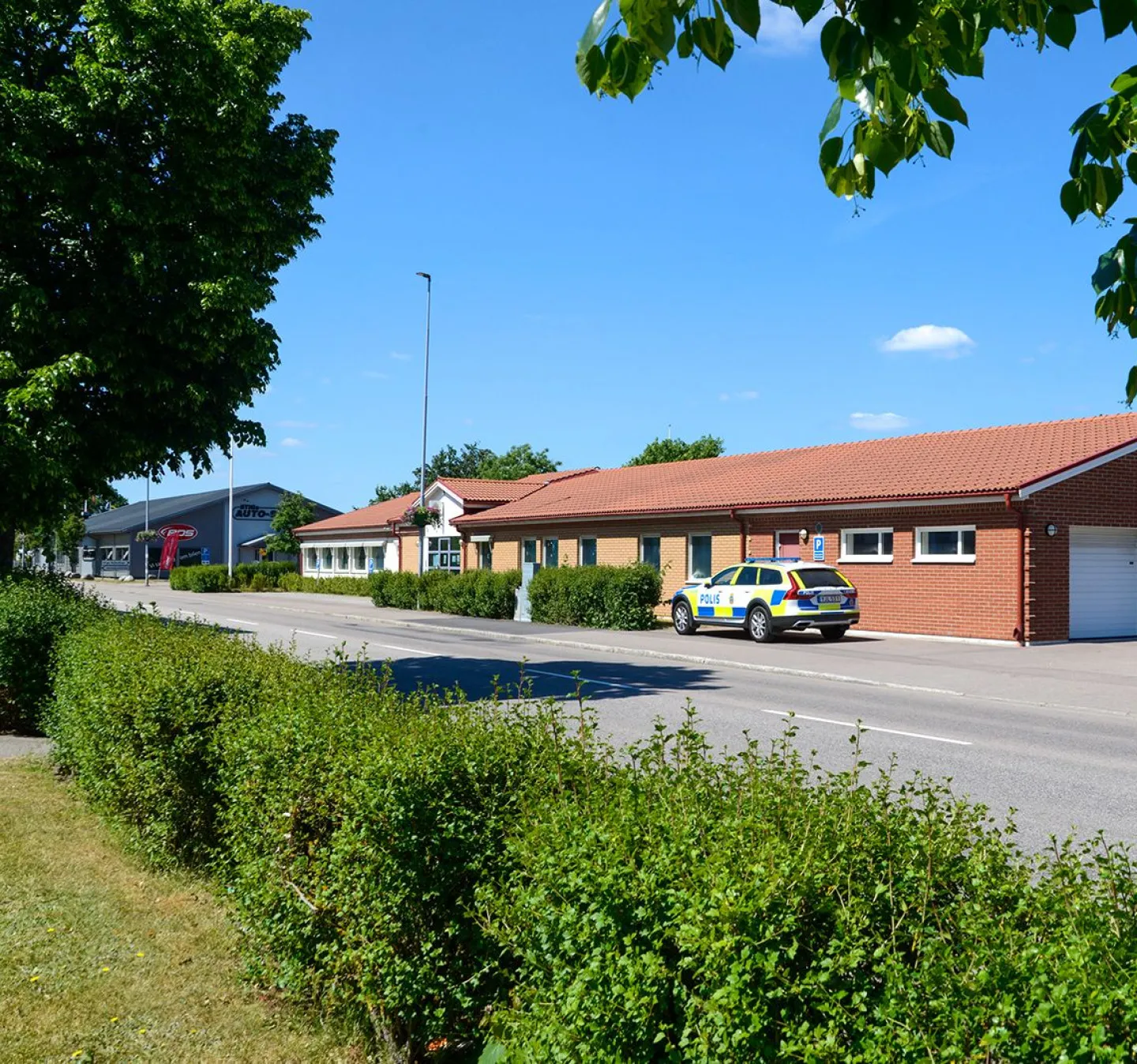 I denna tegelbyggnad på ett plan huserar polismyndigheten. Fastigheten, som omfattar 2 045 kvm, uppfördes 2001 och tillbyggnad skedde 2010.