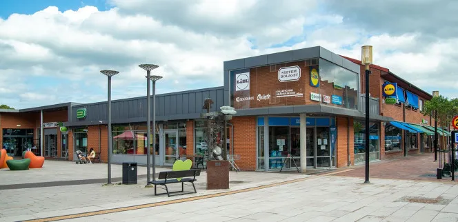 Centralt belägen fastighet i Höganäs med butiker, kontor och bankhus samt en större parkeringsyta.